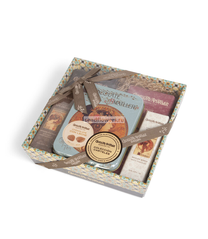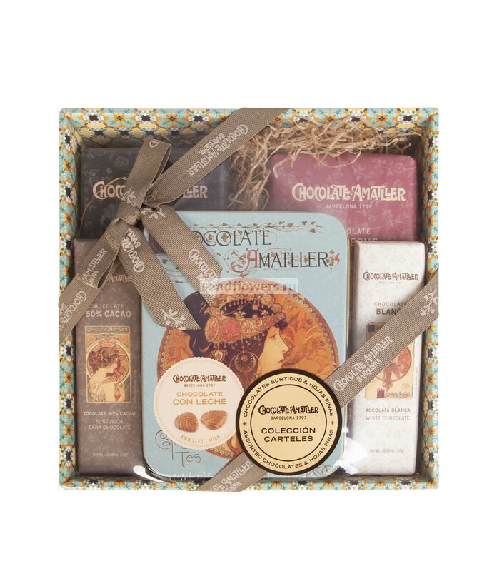 Ассорти из пяти видов шоколада Amatller представлено в красивой прозрачной упаковке, которая позволяет видеть все содержимое, и украшена бантом. Вес: 266 гр.